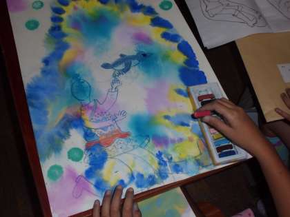 「空飛ぶペンギン」のお話から想像を膨らませて,絵を描いています。主人公のまなちゃんと,ペンギンのマイケルの会話が聞こえてきそうです。