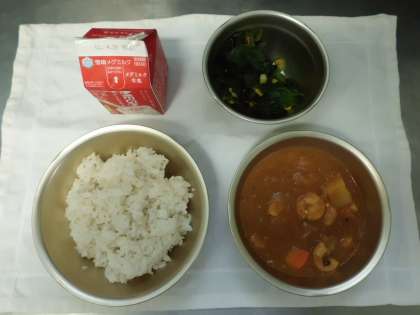 今日のカレーのシーフードは,えび・いか・まぐろフレークが入っていました。いつもの牛肉や鶏肉を使ったカレーとちがう味を楽しむ事ができました。「おいしい・・・」とおかわりも多くの児童がしていました。