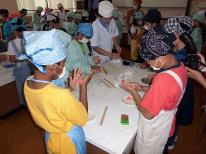 9日(火)午後から和菓子屋さん5人の方々に来ていただき,5年生が和菓子づくり体験をしました。まず,和菓子についての話をしていただき,次に今日作る和菓子2種類を見せていただきました。それぞれ「もみじ」「菊」をモチーフにしたもので秋を感じさせます。見本で作られるのを見ていると,こともなげに進められるのですが,実際につくるときは細かなたくさんのポイントがありました。子どもの手は温かいから,長い間手で持っていてはいけないこと,手を冷やすために水で湿らせたタオルが必要なことなどです。