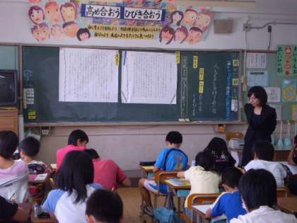 伝えあって考えを深め、意見文を書こうという単元で授業を公開しました。単元の中にPISA型読解力を意識した特設の時間を位置づけ、意見文の特徴を感想文との比較から気づかせる学習をしました。指導助言では、感想文として取り上げたテキスト(自作)の内容が良すぎたこともあり、意見文のとらえ方が不十分であった。そのため、指導者にまよいがでてしまった。と指摘がありました。教材解釈をしっかり行い、よりよい授業を目指していきます。