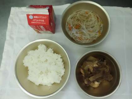 今日の給食は,ごはん・牛乳・牛肉ときのこのいためもの・ビーフンスープでした。