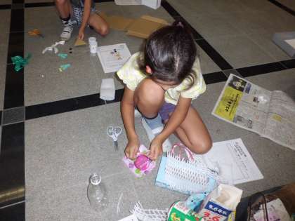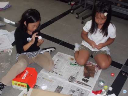 図工の時間に,空き箱や,ペットボトルなどを使って自分で考えた楽しいロボットを作りました。