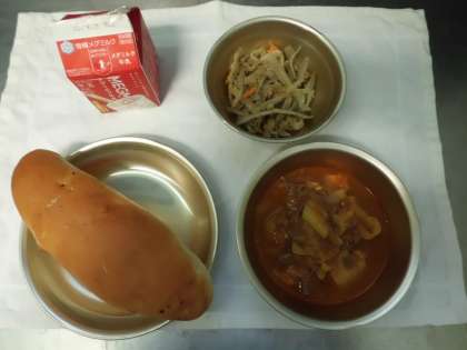 今日の給食は,チーズコッペパン・牛乳・ボルシチ・ごぼうのソティでした。ボルシチは,ロシア料理です。本来はビーツを使い,赤い色をだすのですが,給食ではケチャップやホールトマトで色をつけています。ヨーグルトも加えています。