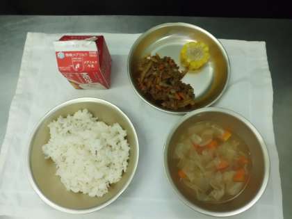 今日の給食は,麦ごはん・牛乳・和風ドライカレー・カットコーン・野菜のスープ煮でした。和風ドライカレーの具は,牛ひき肉とにんじん・ごぼう・こんにゃくでした。味付けは,カレー粉やケチャップ・しょうゆ・赤みそなどで味つけしました。ごはんに混ぜておいしそうに食べていました。カットコーンも喜んでいました。