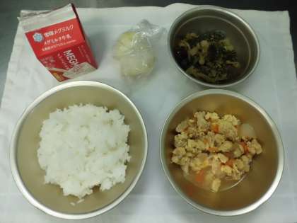今日の給食は,ごはん・牛乳・親子煮・ほうれん草と白菜のごま煮・りんごでした。