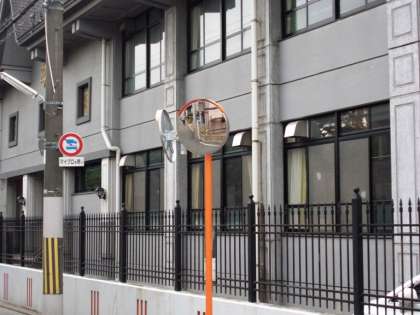 正門を出て少し上がったところに三叉路があります。いつも登下校の子どもたちの安全に気を配るところです。この場所に道路反射鏡が設置されました。行き来する車,バイク,自転車の人だけでなく,歩行者の皆さんにも安全なものです。事故ゼロの記録を更新していかないといけません。