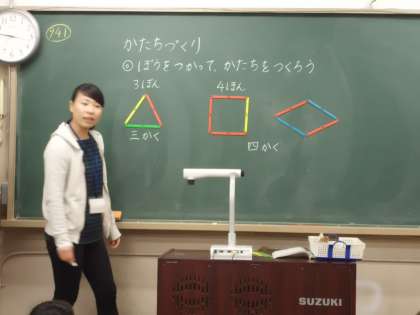 数え棒を使って,いろいろな形を作りました。棒と棒をつなげて,三角や四角を作りました。