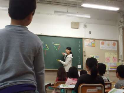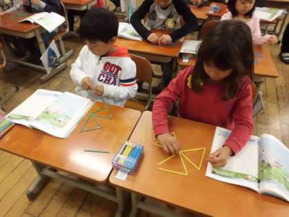 教科書に載っているのと同じ形を作ることに挑戦しました。三角や四角をつなげて,船や風車など,いろいろな形ができました。
