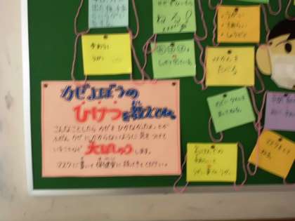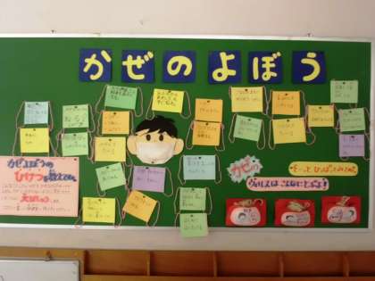 保健室の掲示板にずいぶんマスクが多くなってきました。これは養護教諭が,寒くなってきて,「かぜのよぼうのひけつを教えてね」というテーマで,子どもたちから聞いたことをマスクに書いて掲示しているものです。「やさいをたべる」「すいみんをしっかりとる」「首,足首をひやさないようにする」など,各家庭で子どもたちに声かけをされたり,注意されたりしていることの表れだと思います。