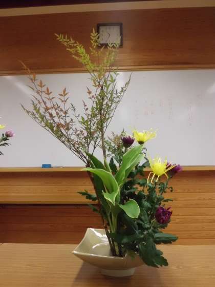 今月のお花は,「南天の木」「糸菊」「赤菊」「ドラセナ」です。