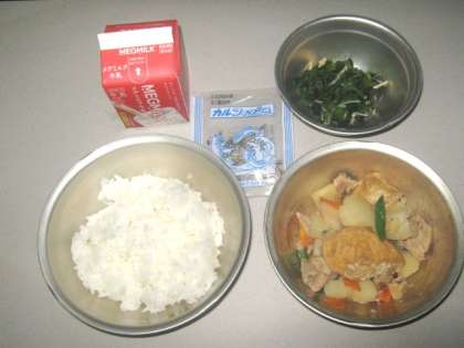 今日の給食は,ごはん・牛乳・煮つけ・煮びたし・じゃこでした。野菜たっぷりでした。なお,明日の給食は今日配布したプリントでお知らせしましたように,炊きこみ五目ごはん・牛乳・みそ汁の台風用献立に変更しています。