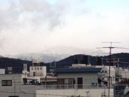 学校に来た教職員から山が白いと聞いたので,屋上から北の山を撮ってみました。比叡山はさすがに白かったですね。天気予報で今年一番の冷え込みというニュースを聞いていましたが,京都市も十分でした。比叡平から通勤している教員に今朝の様子を聞くと,2cmほど雪が積もっていたようです。聞くだけで寒く感じます。