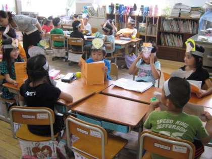国語科の学習「大きなかぶ」では,グループごとに場面の様子を想像しながら読みました。考えた言葉や動作を入れてリズミカルに読む練習をしました。