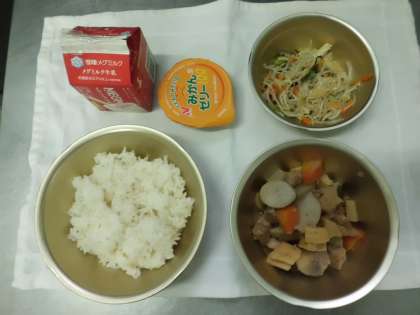 今日の給食は,麦ごはん・牛乳・豚肉と里芋のいため煮・もやしの煮びたし・みかんゼリーでした。もやしの煮びたしは,にんじんやだいこん葉も入っていました。しゃきしゃきとした歯ごたえが食欲をそそりました。
