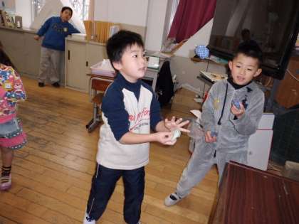 生活科の学習で「むかしあそび」をしています。けん玉や,こま,お手玉など,いろいろな昔遊びに挑戦しています。おうちの人にコツを聞いたり,学童に来られている地域の方に教えてもらったりして練習しています。休み時間にも練習して,どんどん上手になってきました。先生よりも上手になって,教えてあげている子もいます。