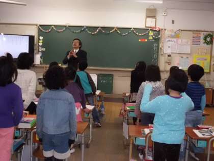 「つながる」の歌を作られた岩下先生が2年生に詩の授業をして下さいました。まず,みんなの詩を読む声を聞いていただきました。「とってもいい声ですね。」と誉めていただきました。毎日,必ずみんなで声をそろえて音読している成果がばっちり出ています。