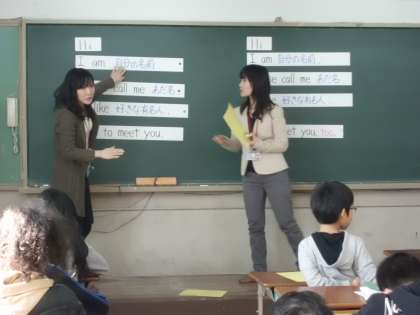 高野中学校より英語科の先生2名に来校していただき,もうすぐ中学校へ進学する6年生に「英語」の授業をしていただきました。小学校でも「英語活動」の学習をしている子どもたちですが,中学校の英語科の先生にしていただく授業はまた少し違ったようです。