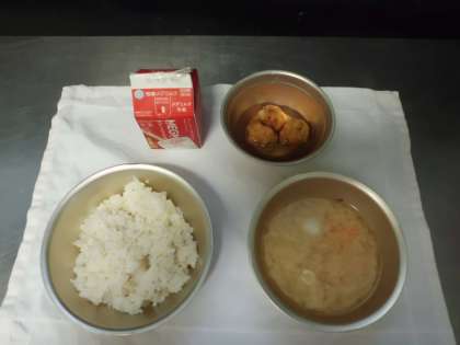 今日の給食は,麦ごはん・牛乳・がんもどきのあんかけ・豚汁でした。がんもどきのあんかけは,1年に1度この寒い時期に登場する献立です。鶏ひき肉に,とうふやおから,にんじんや枝豆・干ししいたけなどの野菜を加えて1こづつ団子に丸めて,油であげます。手作りのがんもどきです。それにけずりぶしでとったあんをかけて食べました。
