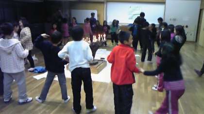 1日目最後のプログラムは,キャンドルファイヤーです。レクレーション係の司会・進行で,ゲームやダンス,歌を楽しみました。このキャンドルファイヤーで,3年1組の子ども同士のつながりが,また一層強くなったように思います。