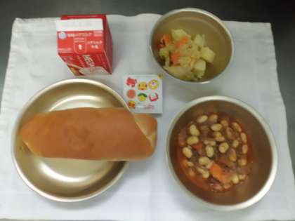 今日の給食は,味付けコッペパン・牛乳・チリコンカーン・野菜のホットマリネ・チーズでした。チリコンカーンは金時豆を使いますが,給食では大豆を使っています。カレー粉やオールスパイスなどの香辛料がよくきいていて,よい香りがしていました。給食は,大豆の献立がよくでてきます。大豆献立の中でも人気のある献立のひとつです。