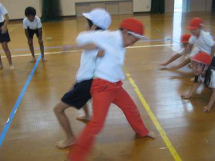 体育では,晴れの日は鉄棒,雨の日は体育館でいろいろな相撲に挑戦しています。