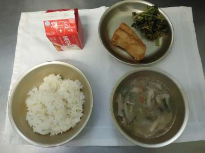 今日の給食は,麦ごはん・牛乳・さわらのたつたあげ・だいこん葉のごまいため・いものこ汁でした。だいこん葉のごまいためは,すりごま・花かつおの風味がよくしておいしかったです。いものこ汁もごぼうの風味やしめじの味・青ねぎの香りなど,具だくさんで香りもよくおいしかったです。