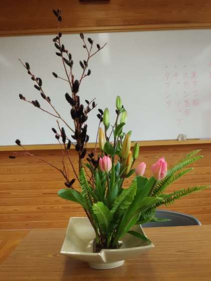 3月9日(土)PTA生花教室が行われました。春らしくチューリップがあり,それを中心として,黒ネコ柳がアクセントとして入っています。スカシ百合とタマシダでバランスをとって下さい。