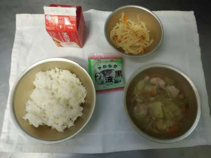 今日の給食は,麦ごはん・牛乳・肉だんごのスープ煮・じゃがいものピリ辛いため・黒大豆でした。肉だんごはやわらかく,またお肉のうまみがスープによくでていました。