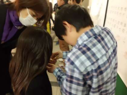 学校の門をくぐった新1年生の胸に名前のバッチをつけてあげました。