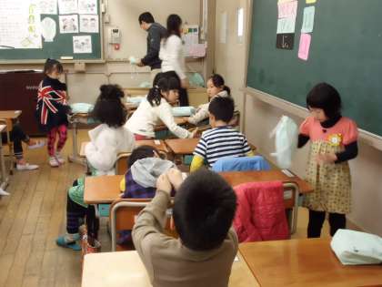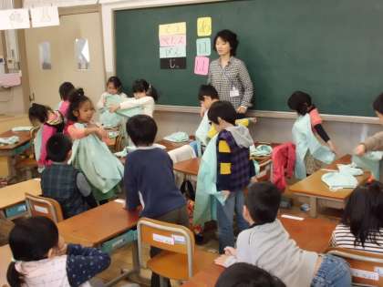 今日から給食が始まります。1年生は当番も全く初めて。今日は栄養教諭からエプロンの着方や片づけ方を教わりました。