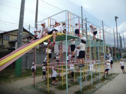 体育科で総合遊具の使い方を学習しました。1年生は,2階までしか行けませんでしたが,2年生からは3階まで登れます。登るコースが6つあって,階段やくさりの階段など自分に合った登り方で3階まで登ろうと挑戦していました。約束を守って,これからも休み時間に楽しく遊んでほしいと思います。