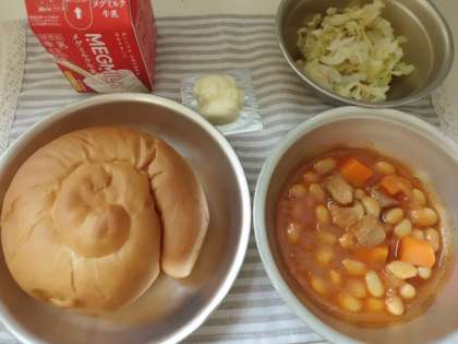 今日の献立は,バターうずまきパン・牛乳・ポークビーンズ・ツナとキャベツのソティ・チーズでした。