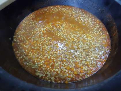 ポークビーンズは大豆と豚肉をトマト味で煮込みます。お昼前になると,給食室からはトマトの良い香りがしてきました。下の写真は,給食室の大きなお鍋でポークビーンズを作っている様子です。