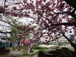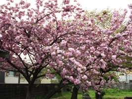 ドリームワールドの八重桜がいま満開を迎えています。その幹のもとに,昭和十七年度初等科・高等科修了植樹の石碑が立っていました。ということは植樹されて70年経っているということです。まだまだ元気な八重桜です。