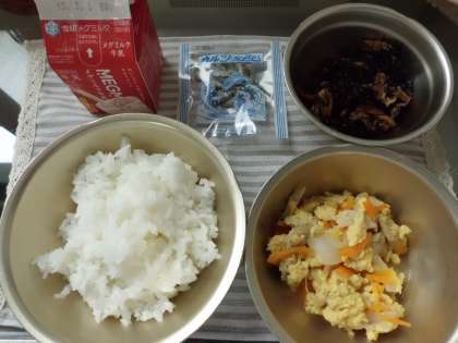 今日の献立は,ごはん・牛乳・親子煮・ひじきの煮つけ・じゃこ でした。