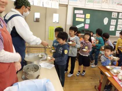 1年生の教室では,親子煮が大人気で「大のおかず増やしたい〜!」とおかわりの行列ができていました。