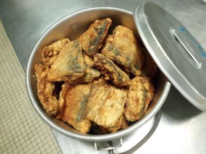 さばのたつたあげは,1つずつていねいに揚げていきます。