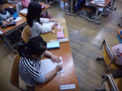 初めての参加日を迎え,子どもたちは楽しみや緊張が入り混じった表情で過ごしていました。国語の学習では,初めに音読をしました。体全部を使って,リズムよく読むようにすると,とても元気でリズミカルな音読になりました。授業の最後には,ひらがな「く」を勉強しました。「し」・「つ」・「く」を習いました。この3文字を使ってできる言葉, おわかりですか。「つくし」です。春らしい言葉です。