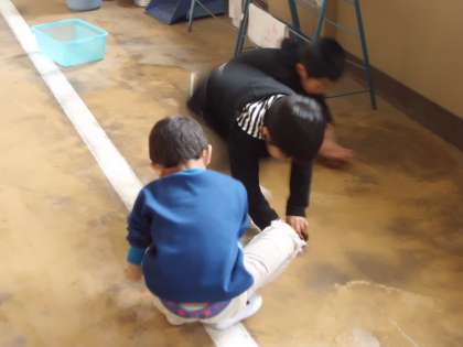 1年生のそうじが始まりました。ほうきやぞうきん,たわしを使ってピカピカにしています。ぞうきんが真黒になったと見せにきてくれます。きれいになった証拠ですね。これからも1年生は,そうじをがんばります。