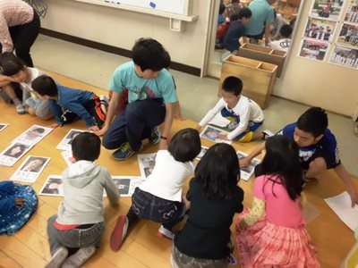 えのき学級からにぎやかな声が聞こえてきたので,見てみるとえのき学級の子どもたちが1年生を迎えてクイズをしているところでした。驚いたのは1年生がずいぶん担任や担当の先生以外の先生の名前をよく知っていることでした。先生たちの大きな写真を使って,クイズやカルタ取りなどをして楽しく過ごしていました。