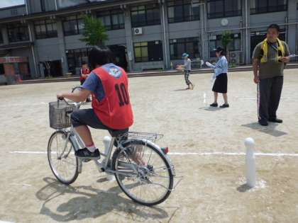 今日は自転車安全教室がありました。普段は何気なく乗っている自転車ですが,今日は安全に乗るための技術やルールを再確認しました。警察の方々や地域の方々に見守られ,子ども達は緊張した表情で取り組んでいました。