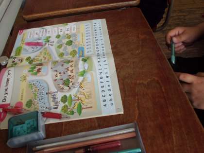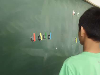 黒板で「b」「d」「p」「q」と似ている形を使ってゲームをしました。