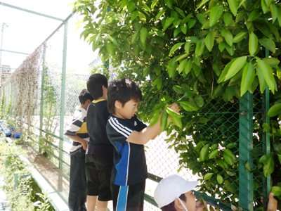 中間休みに運動場のミカンの木に何人かの子どもたちが集まっているので見に行きました。4年生の子どもがアゲハチョウの卵や幼虫がいないか探しに来ているところでした。すると,3年生もやってきて,教室のアゲハチョウの育っている様子やえさのミカンの葉を取りに来たと話してくれました。