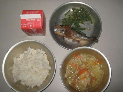 今日の給食は,麦ごはん・牛乳・いわしのしょうが煮・三度豆のごま煮・キャベツのよしの汁でした。低学年も魚の骨を上手にとることができるようになってきました。