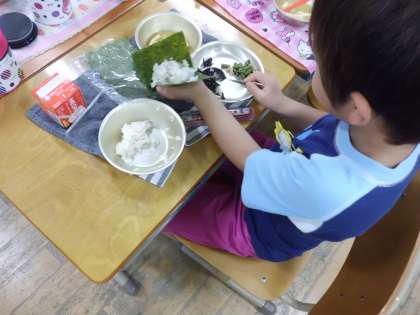 手巻きのりに自分たちでごはんと具をのせておいしいおにぎりを作っていただきます。