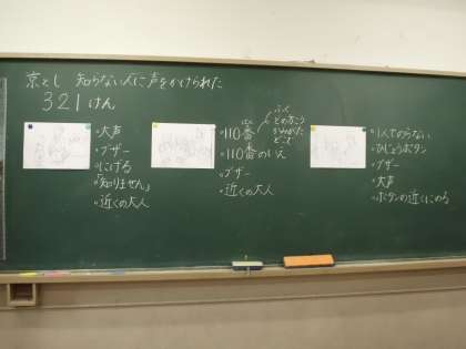 今日,学活の時間で「知らない人」を学習しました。昨年度,京都市では,321件もの子どもに対する声かけ案件がありました。被害に合わないようにするための,対処法を話し合いました。『知らない人の誘いには絶対乗らない。』『不審者の特長を覚える。』