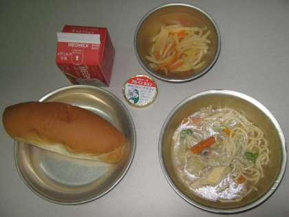 今日の給食は,小型コッペパン・牛乳・五目ラーメン・じゃがいものピリカラいため・クリームチーズでした。子どもたちは,めん類が大好きなので喜んで食べていました。じゃがいものピリカラいためもシャキシャキと歯ごたえがよく,子どもたちの好きな献立です。
