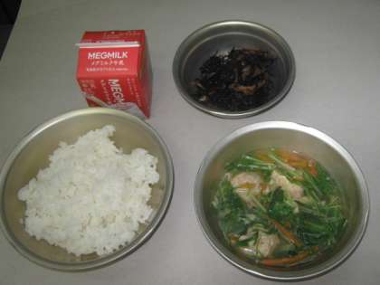 今日の給食は,ごはん・牛乳・水菜とつみれのはりはり鍋・ひじきの煮つけでした。