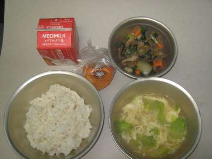 給食で初めてレタスを使いました。レタスの緑色と卵の黄色がとてもきれいなスープでした。きのこの苦手な児童も多いのですが,大好きなプルコギなのでよく食べていました。デザートに柿もついていて,「甘い」「かたい」などといいながら,楽しそうに食べていました。