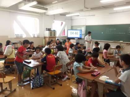 早速,授業がスタートしました。「道徳」の授業では,「かるた」形式で子どもたちは,札を取りそこに書いてある夏休みの思い出を話していました。友だちにいろいろな話をして楽しかったのか,予定の時間が来ても「もう少し」と話す時間を伸ばしてほしいという子どもも見られました。
